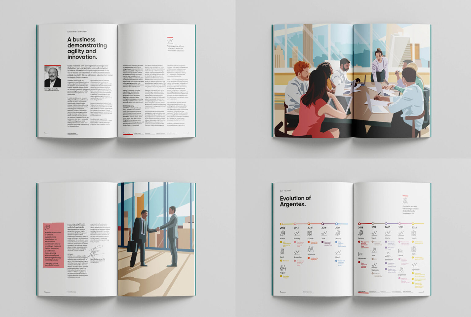 Since then, we have lead the design updates of the respective last five years worth of reports. Utilising the core template created in 2020 but updating the illustrations and copy to reflect the companies development.