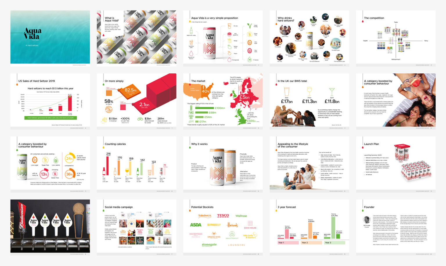 After extensive market research to gauge the demand for hard seltzer, I introduced the name “Aqua Vida,” drawing inspiration from the Latin phrase “aqua vitae,” which translates to “water of life” and reflects the historical roots of alcohol distillation. In addition to crafting initial logo, branding, and can design concepts, I produced comprehensive investment presentation materials to support the project’s launch.